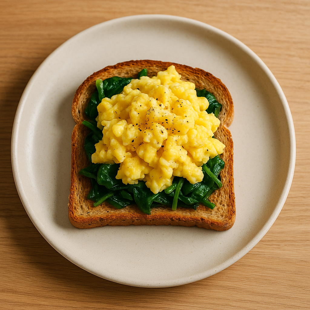 • Étapes : faites tomber les épinards, brouillez les œufs, salez/poivrez, dressez sur le pain grillé.