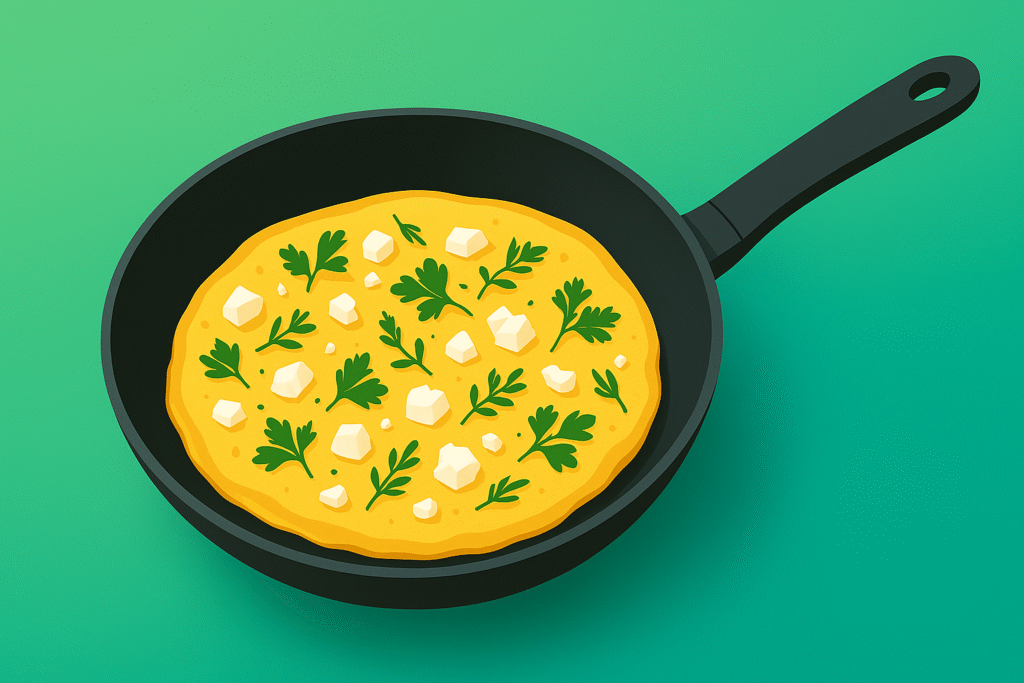 • Ingrédients : 2 œufs, 30–40 g de feta, herbes (persil, ciboulette), huile d’olive.