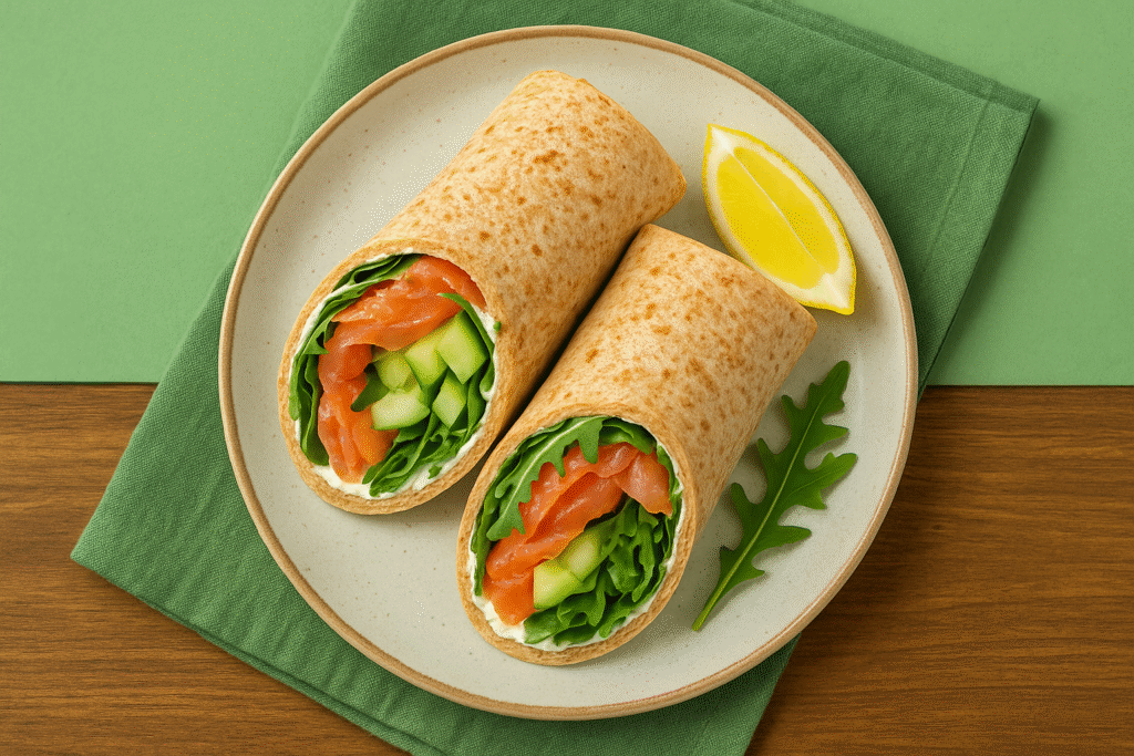 Pourquoi ? Le saumon fumé apporte protéines et oméga‑3. Avec fromage frais et crudités, le wrap reste frais et rassasiant.
