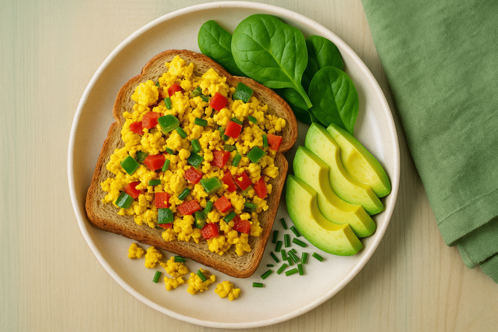 • Ingrédients : 120–150 g tofu ferme émietté, 1/2 poivron, 1 c.à.c huile, curcuma, poivre, sel.