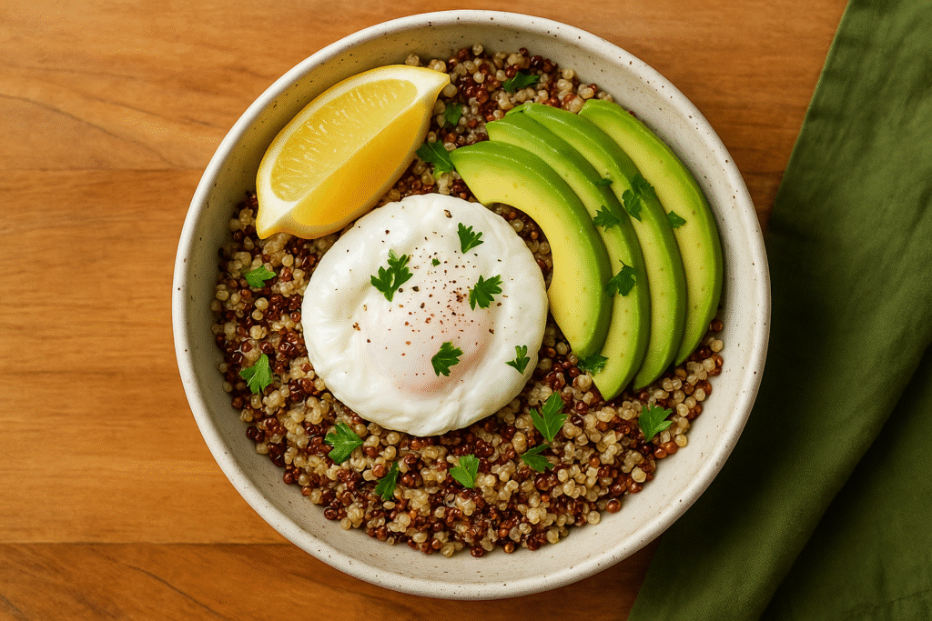 Pourquoi ? Le quinoa (pseudo‑céréale) fournit protéines et fibres. Un œuf poché ajoutera une protéine complète et une texture gourmande.